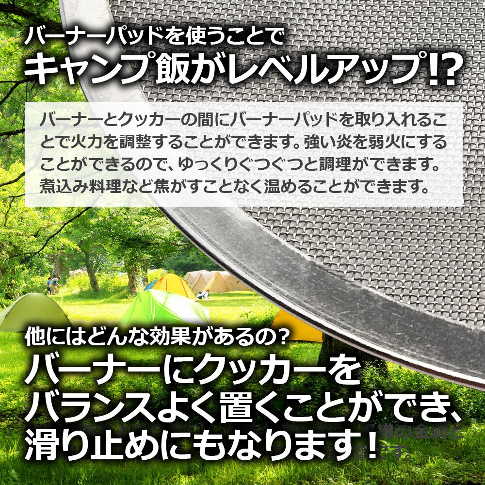 強い火力の炎を優しい赤外線の熱に変える特殊耐熱鋼メッシュのバーナーパッド。パッドを使用することで調理器具の底に均等に熱を伝えて加熱することができます。「バーナーなどの直立した火で中心だけ焦げた」「火の通りに偏りが起こった」というようなクッカーやメスティンなどの焦げ付きや調理時の失敗を少なくすることができます。綾織の網は平織と比べて線径が太く密度と強度が高くなるため、長期間お使いいただけます。