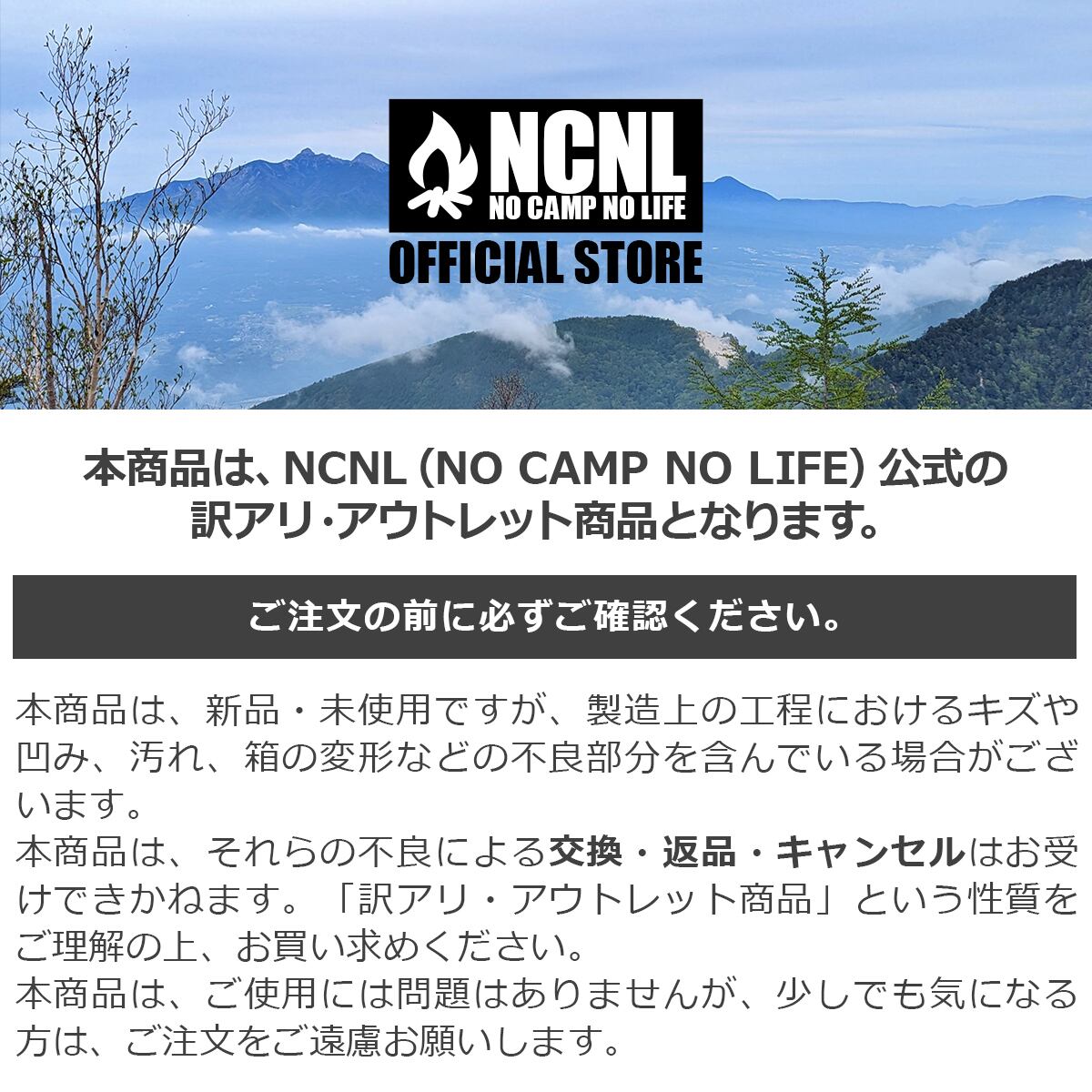 NCNL(NO CAMP NO LIFE)は、デザインや形状にこだわり過ぎて高価になり手が届かないような製品作りはしたくないと考えています。気兼ねなく普段使い出来る、身近にキャンプを感じてもらえるような「価格」「使いやすさ」を重視し、アウトドアを楽しむ全ての方々のお手伝いをする為、様々な商品を提供できるよう大阪より発信しております。
