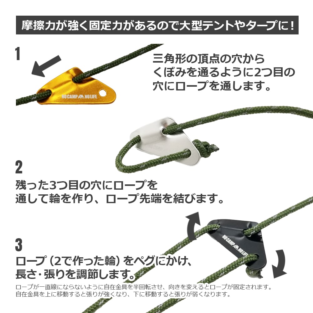 自在金具 三角型 オレンジゴールド 12個セット アルミニウム テント タープ ロープ 長さ調整 ロープテンショナー ガイラインライナー ロープ張り 張り用 テントアクセサリー ソロキャンプ アウトドア用品 キャンプ用品 収納用ワイヤー付き | NCNL(NO CAMP NO LIFE)公式オンラインストア