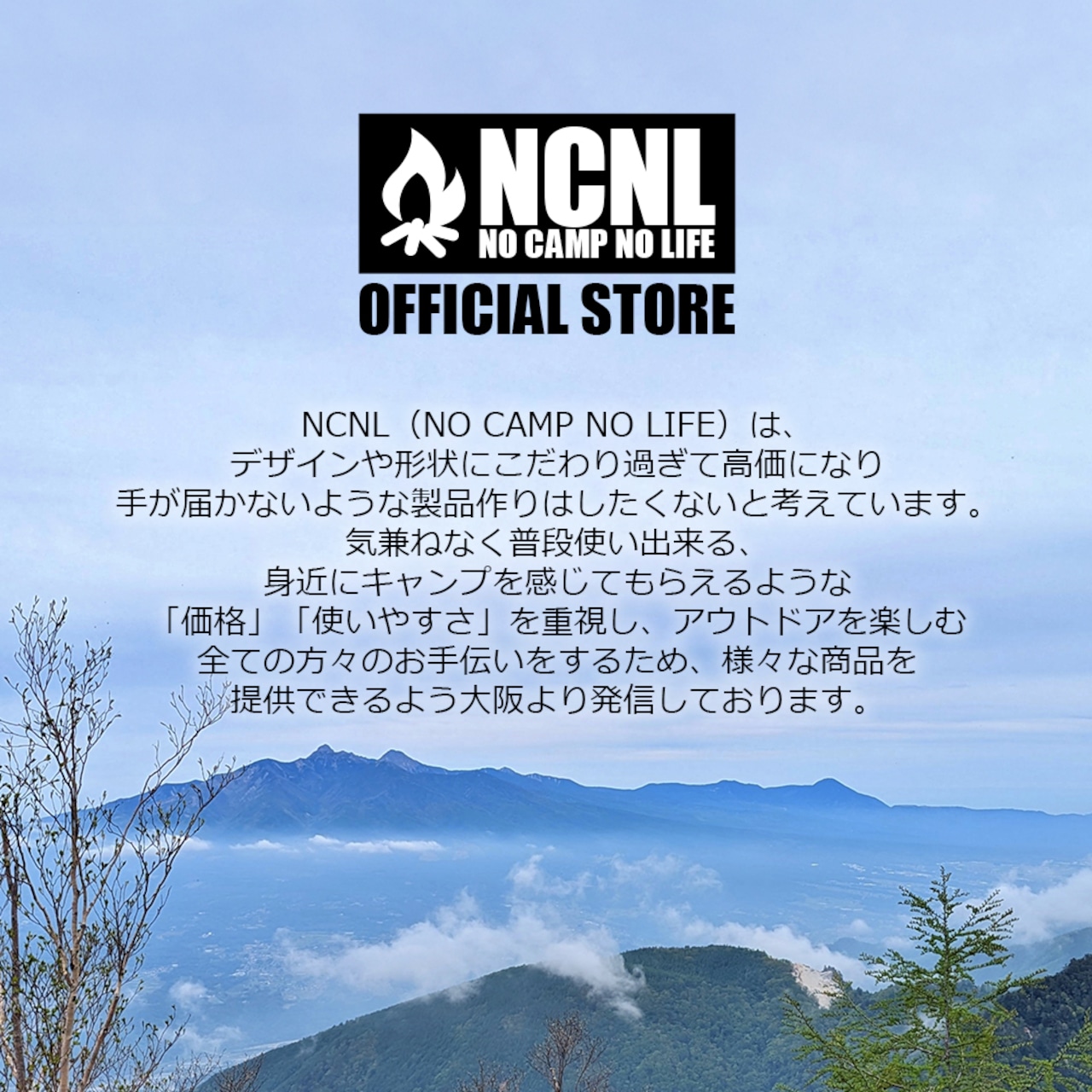 NCNL(NO CAMP NO LIFE)は、デザインや形状にこだわり過ぎて高価になり手が届かないような製品作りはしたくないと考えています。気兼ねなく普段使い出来る、身近にキャンプを感じてもらえるような「価格」「使いやすさ」を重視し、アウトドアを楽しむ全ての方々のお手伝いをする為、様々な商品を提供できるよう大阪より発信しております。