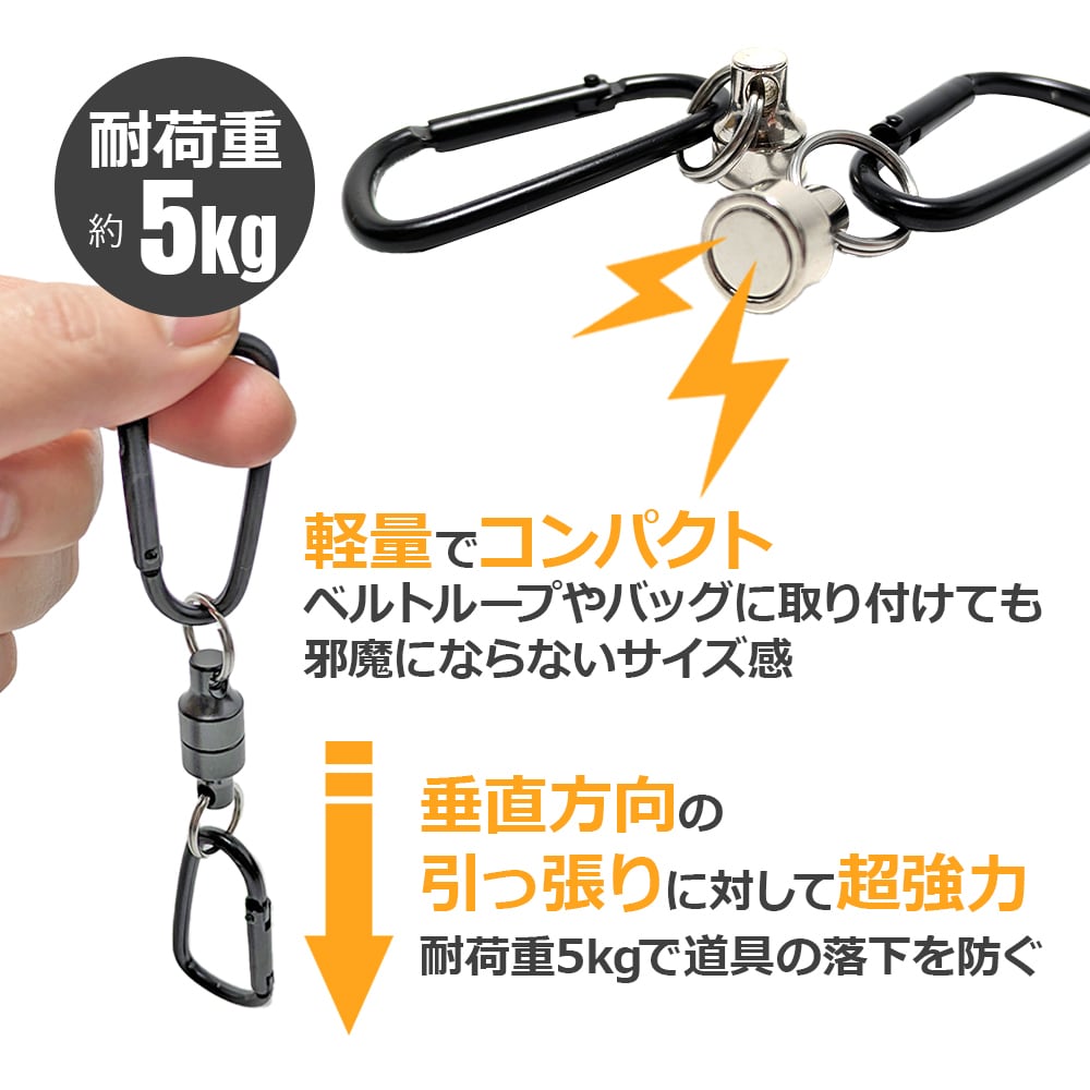 強力ネオジム磁石でよく使うキャンプ道具などをしっかり固定。小物の携帯に便利なマグネットリリーサー。安心の耐荷重5kg。キャンプでのアウトドア道具、釣りのタモ(玉網)、工事やDIYの道具の持ち運びに。カラビナ付きでバッグやベルトループなどに簡単に取り付け可能。ランタンをテントから吊るすなど様々な用途にお使いいただけます。