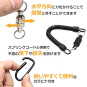 垂直方向の引っ張りに対して強力ですが、水平方向にスライドで簡単に外すことができます。ワンアクションで着脱できて、取り付けたアイテムを自由に取り外して使うことができます。スプリングコードと併用することでアウトドア小物の不意の落下や紛失を防ぎます。磁石には亜鉛ニッケル合金メッキで処理をしているので、耐食性に非常に優れています。