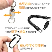 垂直方向の引っ張りに対して強力ですが、水平方向にスライドで簡単に外すことができます。ワンアクションで着脱できて、取り付けたアイテムを自由に取り外して使うことができます。スプリングコードと併用することでアウトドア小物の不意の落下や紛失を防ぎます。磁石には亜鉛ニッケル合金メッキで処理をしているので、耐食性に非常に優れています。