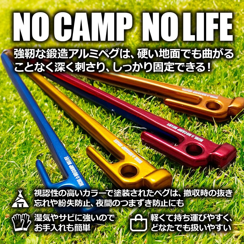 軽くて頑丈なアルミペグは、レジャーシート、ソロキャン用のテント、タープやシェード、ファミリーサイズの大型テントまでしっかり固定。強風時などキャンプ場の状況に応じて補助的に使うサブのペグとしても。撤収時はヘッド部分の穴にハンマーなどのフックを掛けることで簡単に引き抜くことが可能。アルマイト加工の優れた耐食性で湿気やサビに強く、雨の日でも安心。収納袋があるのでペグが汚れたままでも片付けることが可能。